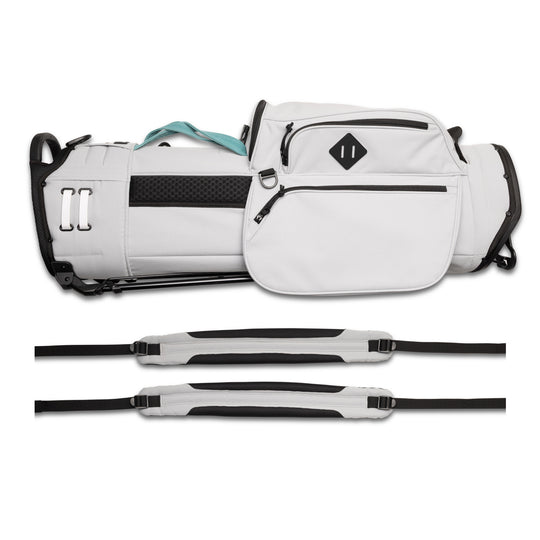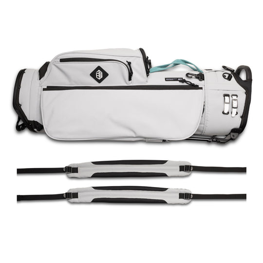 Designed with a versatile single or double shoulder strap configuration the Trouper 3.0 is your ideal companion on the course. A large insulated front cooler pocket has enough space to keep four 16oz cans cold. The two newly improved fleece-lined valuable compartments and seven-pocket design secures valuables while allowing for straightforward access. A large five-way divider allows for simple organization and an easy pull for all 14 clubs even with oversized grips. Simply put the Trouper 3.0 delivers an effortless and reliable experience for any player round after round. Featuring All-New Straps and a bolstered stand mechanism.